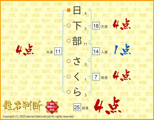生活面を象徴する運勢です。外部から受ける影響力を表し、結婚運、家庭運や職場、環境への順応性を表します。総運から人運を引いた画数。姓や名が1文字の場合を除く。