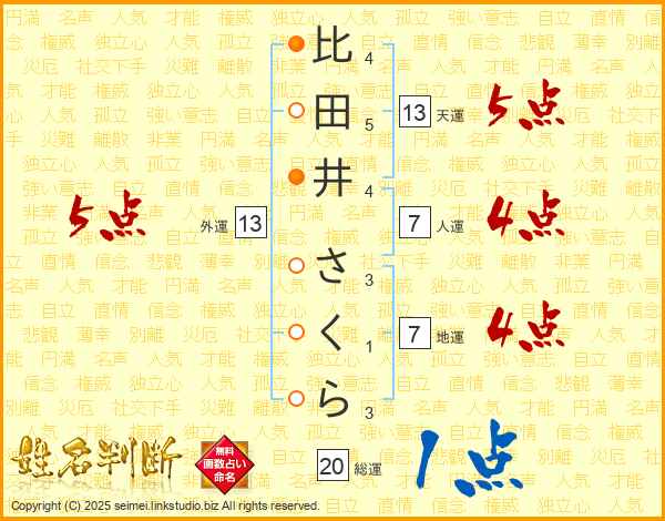 生活面を象徴する運勢です。外部から受ける影響力を表し、結婚運、家庭運や職場、環境への順応性を表します。総運から人運を引いた画数。姓や名が1文字の場合を除く。