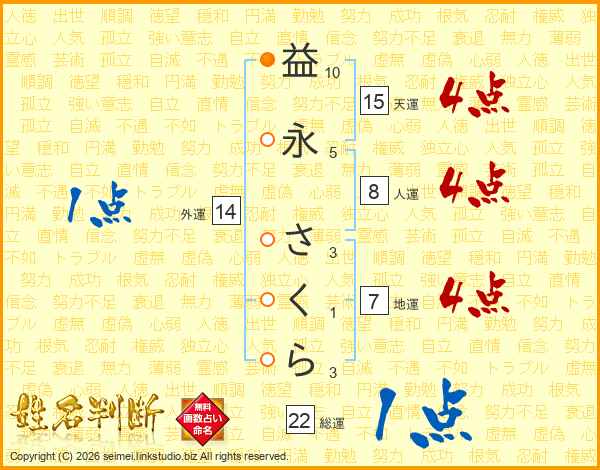 益永さくらさんの総運は22画の1点!