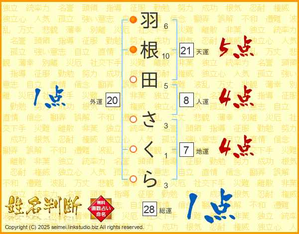 羽根田さくらさんの天運は21画の5点!