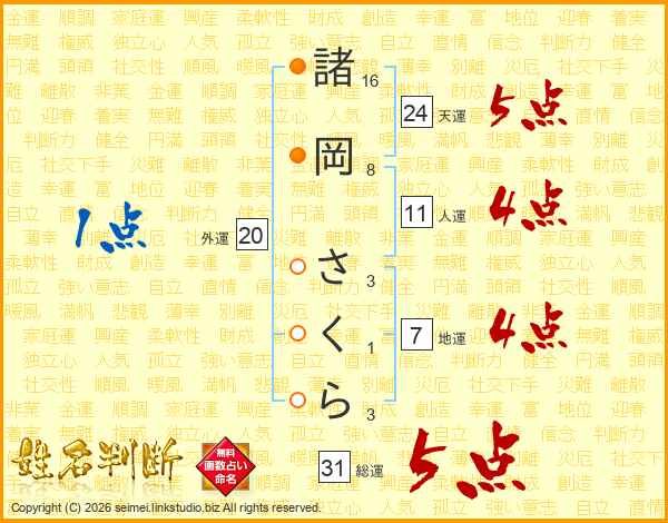 諸岡さくらさんの総運は31画の5点!