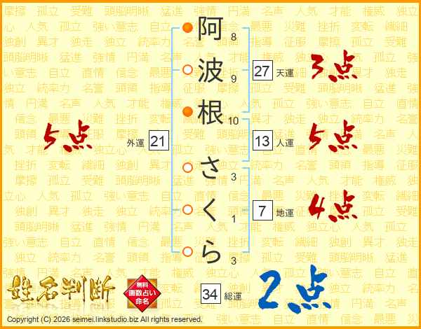 阿波根さくらさんの総運は34画の2点!