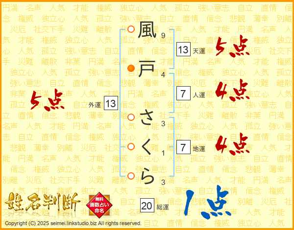 生活面を象徴する運勢です。外部から受ける影響力を表し、結婚運、家庭運や職場、環境への順応性を表します。総運から人運を引いた画数。姓や名が1文字の場合を除く。