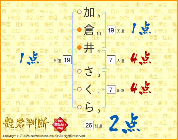 生活面を象徴する運勢です。外部から受ける影響力を表し、結婚運、家庭運や職場、環境への順応性を表します。総運から人運を引いた画数。姓や名が1文字の場合を除く。