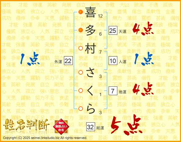 喜(12画)多(6画)村(7画) さ(3画)く(1画)ら(3画)
