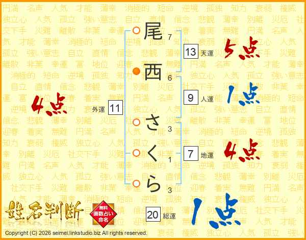 尾(7画)西(6画) さ(3画)く(1画)ら(3画)