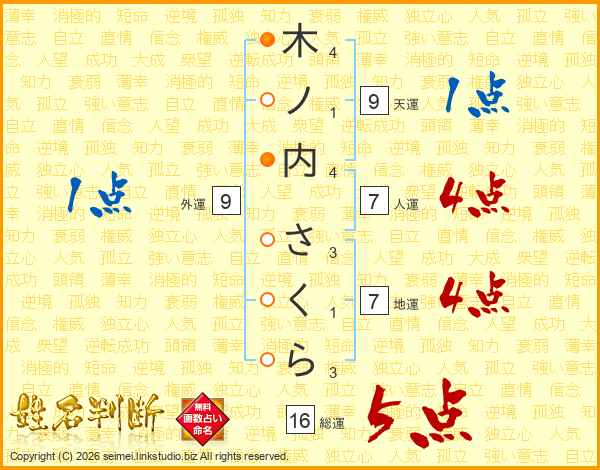 木(4画)ノ(1画)内(4画) さ(3画)く(1画)ら(3画)