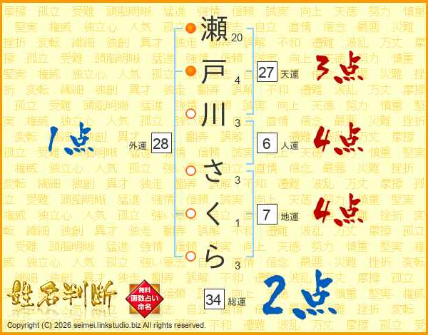 瀬戸川さくらさんの総運は34画の2点!