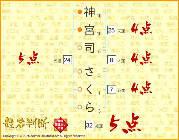 神(10画)宮(10画)司(5画)  さ(3画)く(1画)ら(3画)