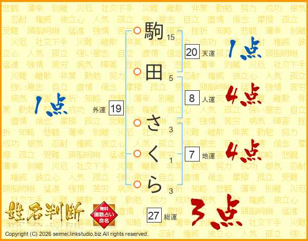 駒田さくらさんの総運は27画の3点!