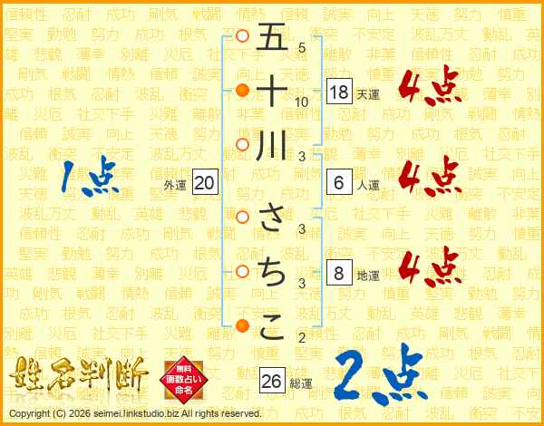 五十川さちこさんの総運は26画の2点!