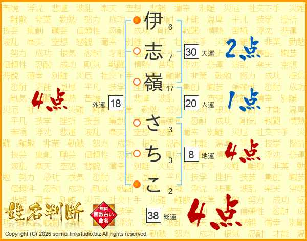 伊志嶺さちこさんの総運は38画の4点!