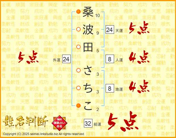 生活面を象徴する運勢です。外部から受ける影響力を表し、結婚運、家庭運や職場、環境への順応性を表します。総運から人運を引いた画数。姓や名が1文字の場合を除く。