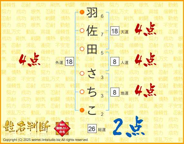 羽(6画)佐(7画)田(5画) さ(3画)ち(3画)こ(2画)