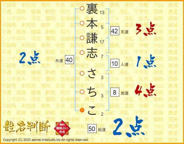 裏(13画)本(5画)謙(17画)志(7画) さ(3画)ち(3画)こ(2画)