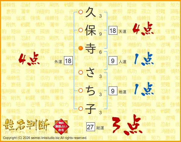 久(3画)保(9画)寺(6画) さ(3画)ち(3画)子(3画)