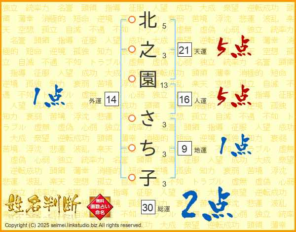 生活面を象徴する運勢です。外部から受ける影響力を表し、結婚運、家庭運や職場、環境への順応性を表します。総運から人運を引いた画数。姓や名が1文字の場合を除く。