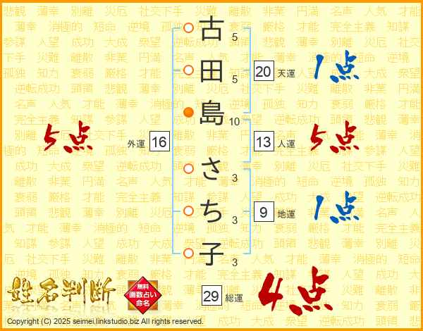古(5画)田(5画)島(10画) さ(3画)ち(3画)子(3画)