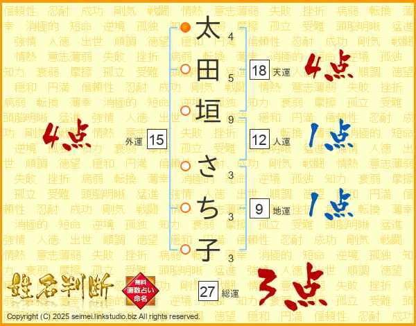 太(4画)田(5画)垣(9画) さ(3画)ち(3画)子(3画)