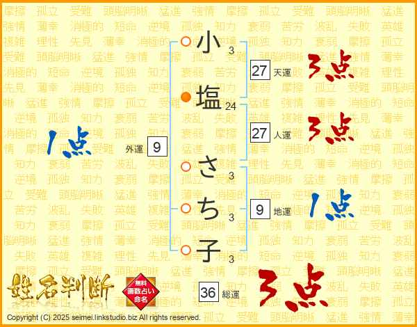 小(3画)塩(24画) さ(3画)ち(3画)子(3画)
