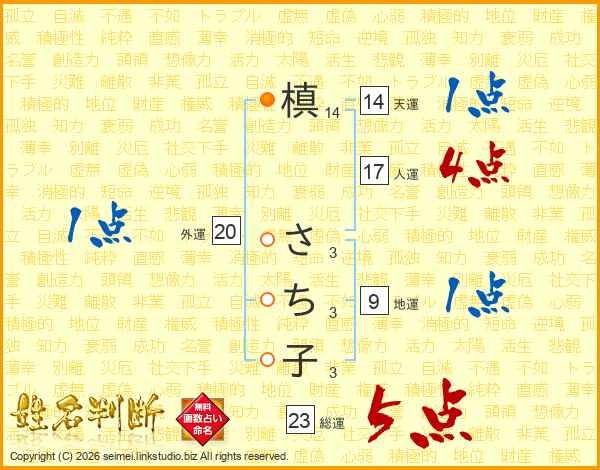 槙(14画) さ(3画)ち(3画)子(3画)