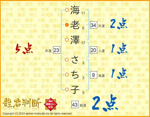 海(11画)老(6画)澤(17画) さ(3画)ち(3画)子(3画)