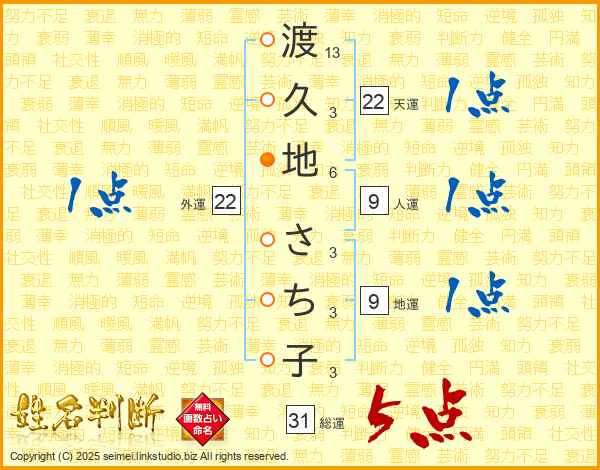 渡(13画)久(3画)地(6画) さ(3画)ち(3画)子(3画)