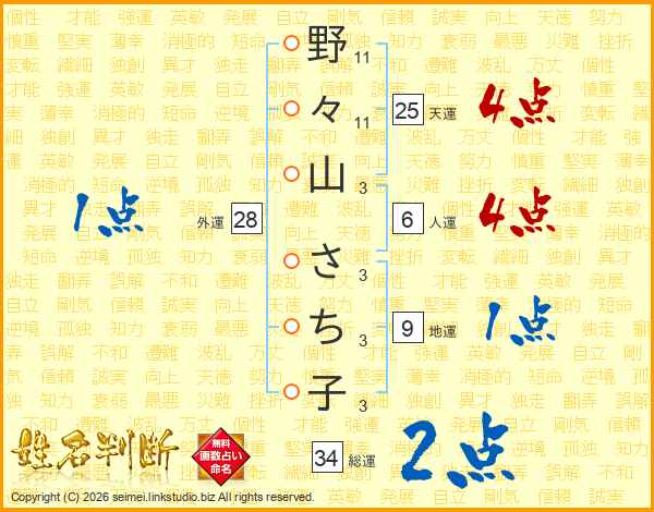 野(11画)々(11画)山(3画) さ(3画)ち(3画)子(3画)