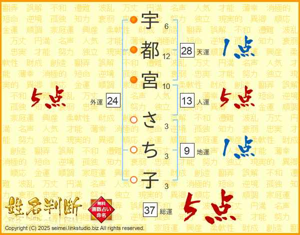 宇(6画)都(12画)宮(10画) さ(3画)ち(3画)子(3画)