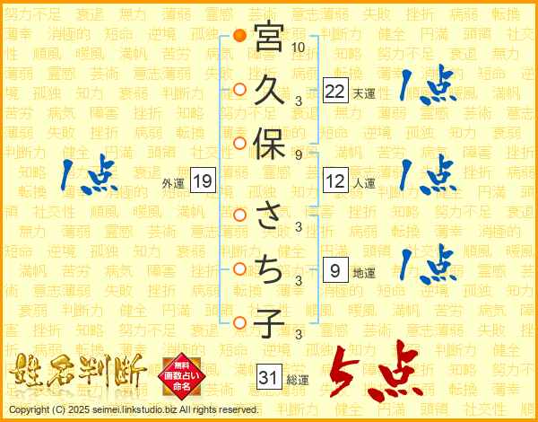 宮(10画)久(3画)保(9画) さ(3画)ち(3画)子(3画)