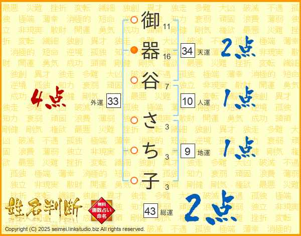 御(11画)器(16画)谷(7画) さ(3画)ち(3画)子(3画)