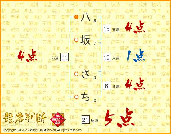 生活面を象徴する運勢です。外部から受ける影響力を表し、結婚運、家庭運や職場、環境への順応性を表します。総運から人運を引いた画数。姓や名が1文字の場合を除く。