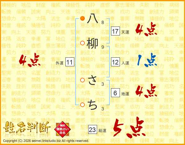 八柳さちさんの総運は23画の5点!