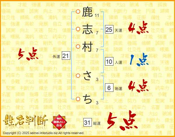 鹿(11画)志(7画)村(7画) さ(3画)ち(3画)