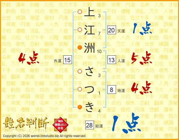 生活面を象徴する運勢です。外部から受ける影響力を表し、結婚運、家庭運や職場、環境への順応性を表します。総運から人運を引いた画数。姓や名が1文字の場合を除く。