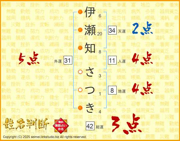 伊(6画)瀬(20画)知(8画) さ(3画)つ(1画)き(4画)