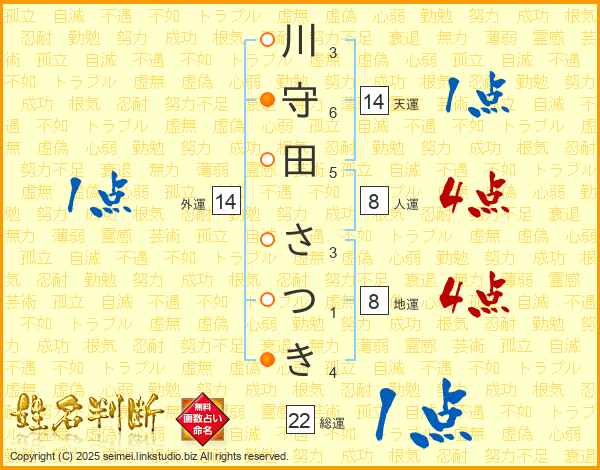 生活面を象徴する運勢です。外部から受ける影響力を表し、結婚運、家庭運や職場、環境への順応性を表します。総運から人運を引いた画数。姓や名が1文字の場合を除く。