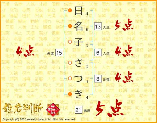 日名子さつきさんの総運は21画の5点!