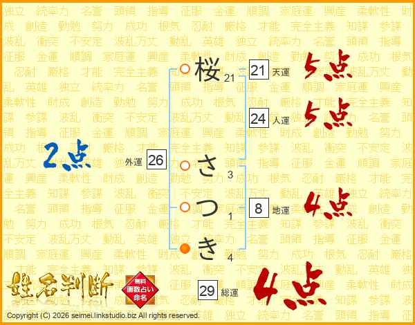 生活面を象徴する運勢です。外部から受ける影響力を表し、結婚運、家庭運や職場、環境への順応性を表します。総運から人運を引いた画数。姓や名が1文字の場合を除く。