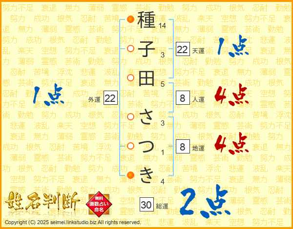 生活面を象徴する運勢です。外部から受ける影響力を表し、結婚運、家庭運や職場、環境への順応性を表します。総運から人運を引いた画数。姓や名が1文字の場合を除く。