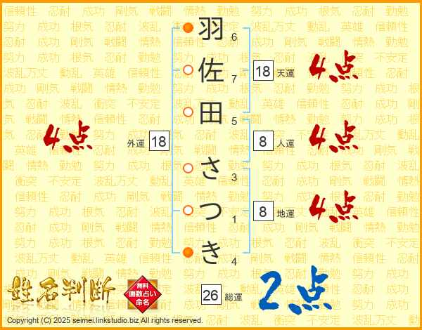 羽(6画)佐(7画)田(5画) さ(3画)つ(1画)き(4画)
