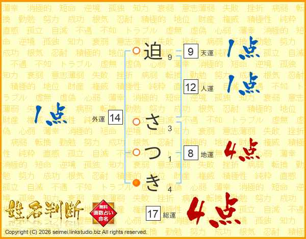 生活面を象徴する運勢です。外部から受ける影響力を表し、結婚運、家庭運や職場、環境への順応性を表します。総運から人運を引いた画数。姓や名が1文字の場合を除く。