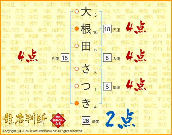 大(3画)根(10画)田(5画) さ(3画)つ(1画)き(4画)