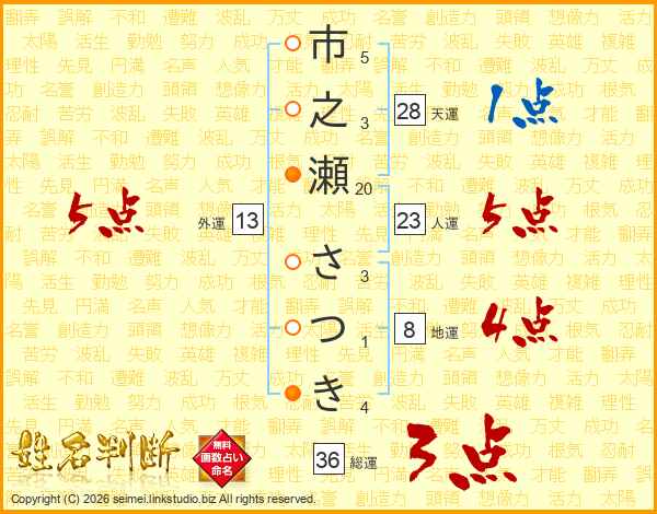 市(5画)之(3画)瀬(20画) さ(3画)つ(1画)き(4画)