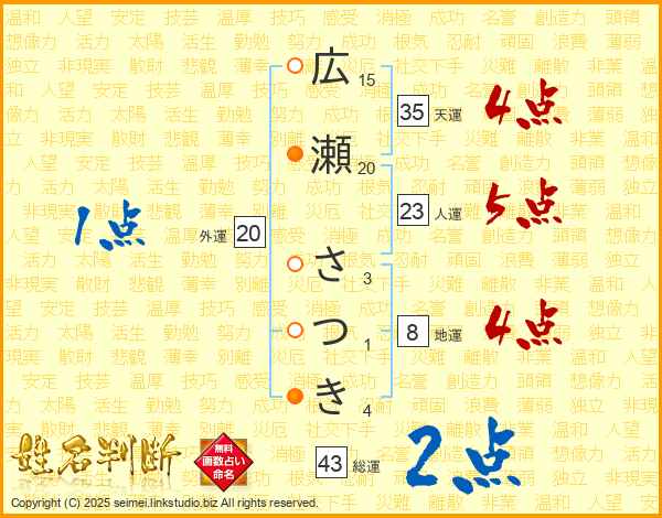 広瀬さつきさんの総運は43画の2点!