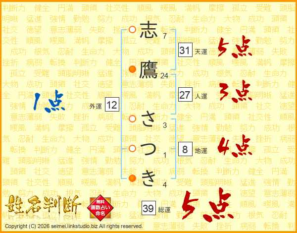 志(7画)鷹(24画) さ(3画)つ(1画)き(4画)