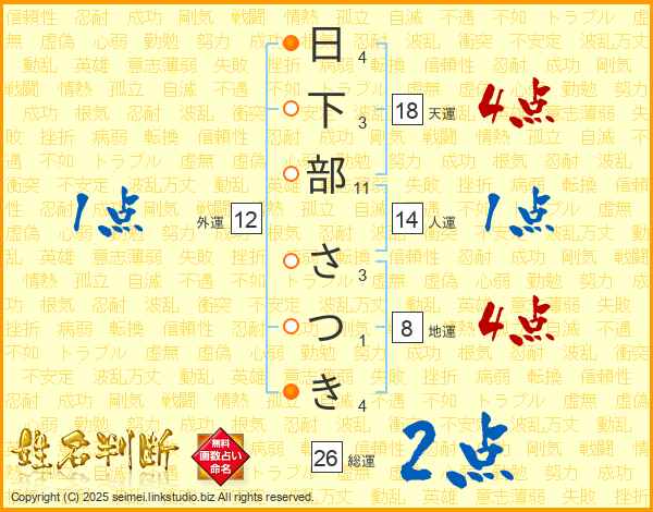 生活面を象徴する運勢です。外部から受ける影響力を表し、結婚運、家庭運や職場、環境への順応性を表します。総運から人運を引いた画数。姓や名が1文字の場合を除く。
