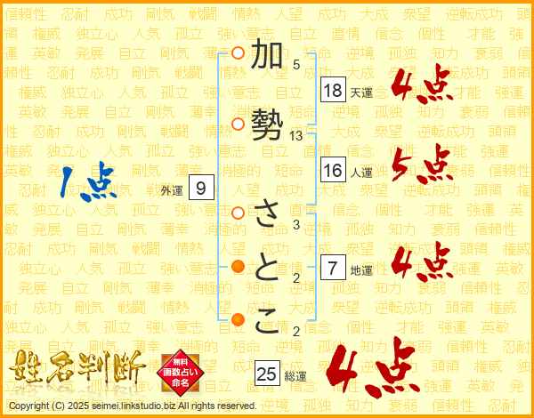 加勢さとこさんの総運は25画の4点!