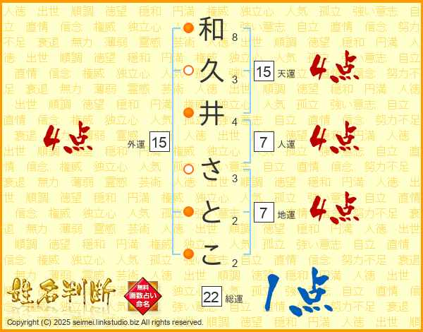 生活面を象徴する運勢です。外部から受ける影響力を表し、結婚運、家庭運や職場、環境への順応性を表します。総運から人運を引いた画数。姓や名が1文字の場合を除く。