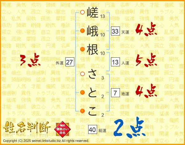 嵯(13画)峨(10画)根(10画) さ(3画)と(2画)こ(2画)